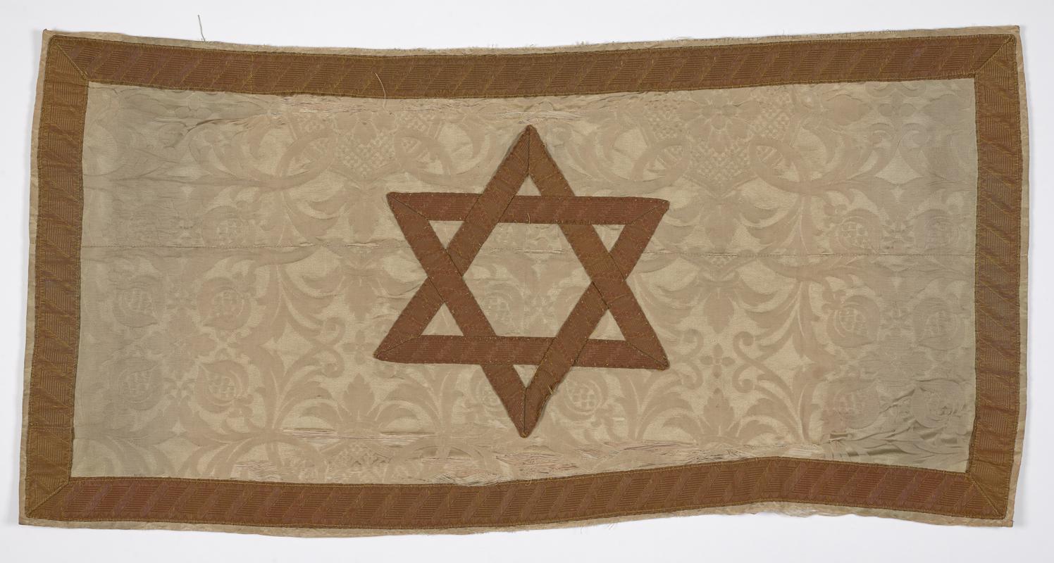 Cover for a large reading desk on high holidays. Cream silk and cotton damask, edged with gold braid, Star of David in gold braid in centre.