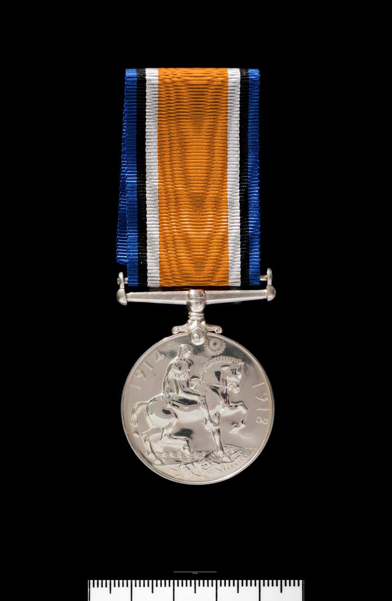 Medal Ryfel Prydain 1914-1918 ar far. Cyflwynwyd i John Daniel Jones, peiriannydd, ganed yn Aber-big, Gwent ym 1888.