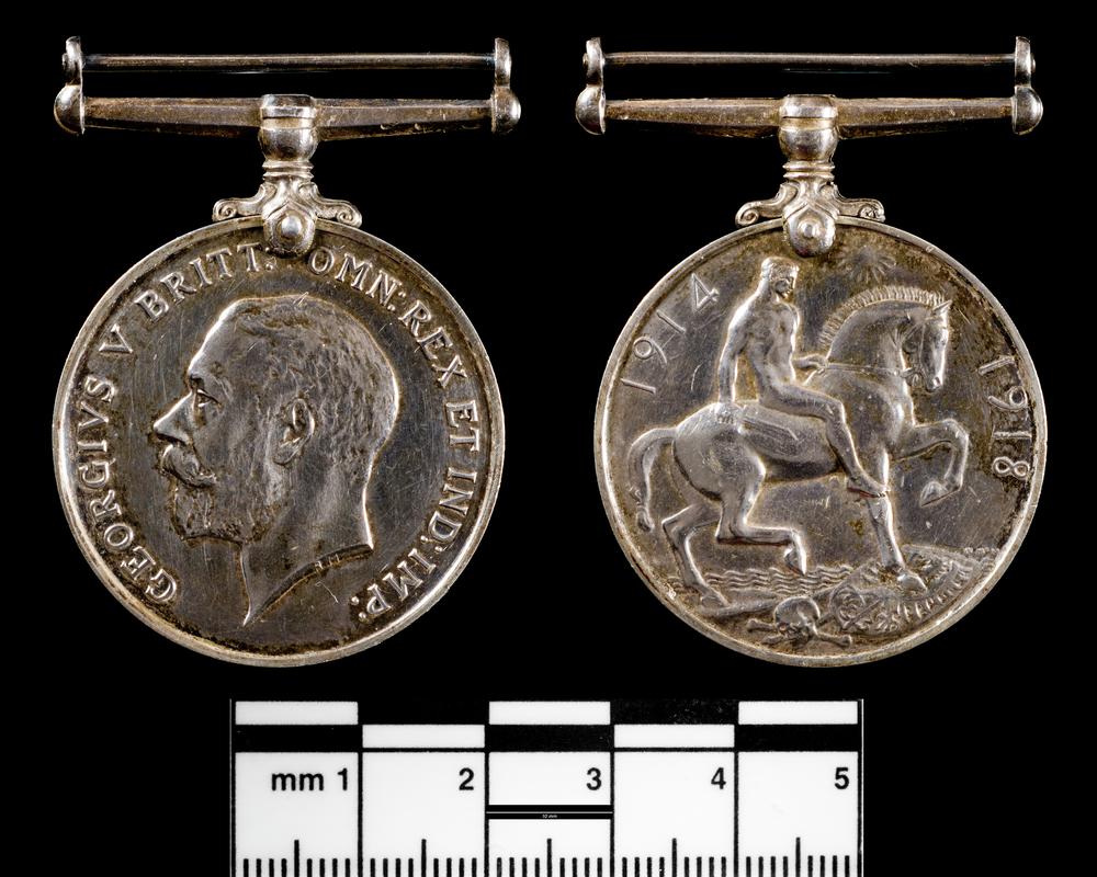 Medal Ryfel Prydain 1914-1918 ar far. Cyflwynwyd i John Daniel Jones, peiriannydd, ganed yn Aber-big, Gwent ym 1888.