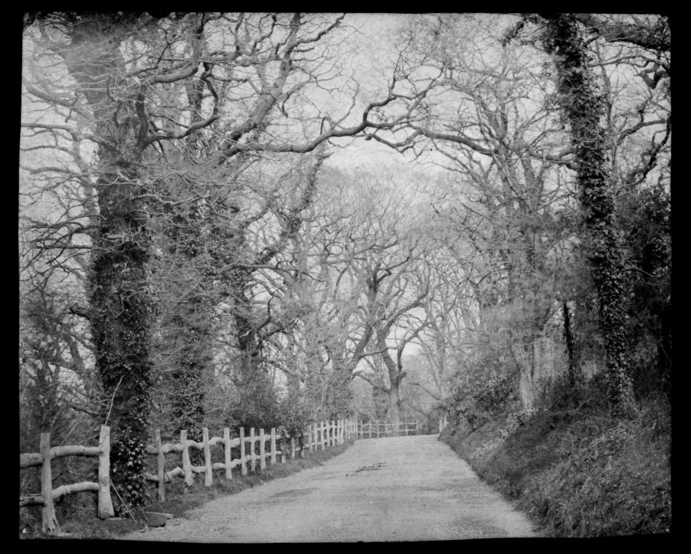 Waxed calotype negative with no tabs. Driveway to Penllergare through wooded landscape.