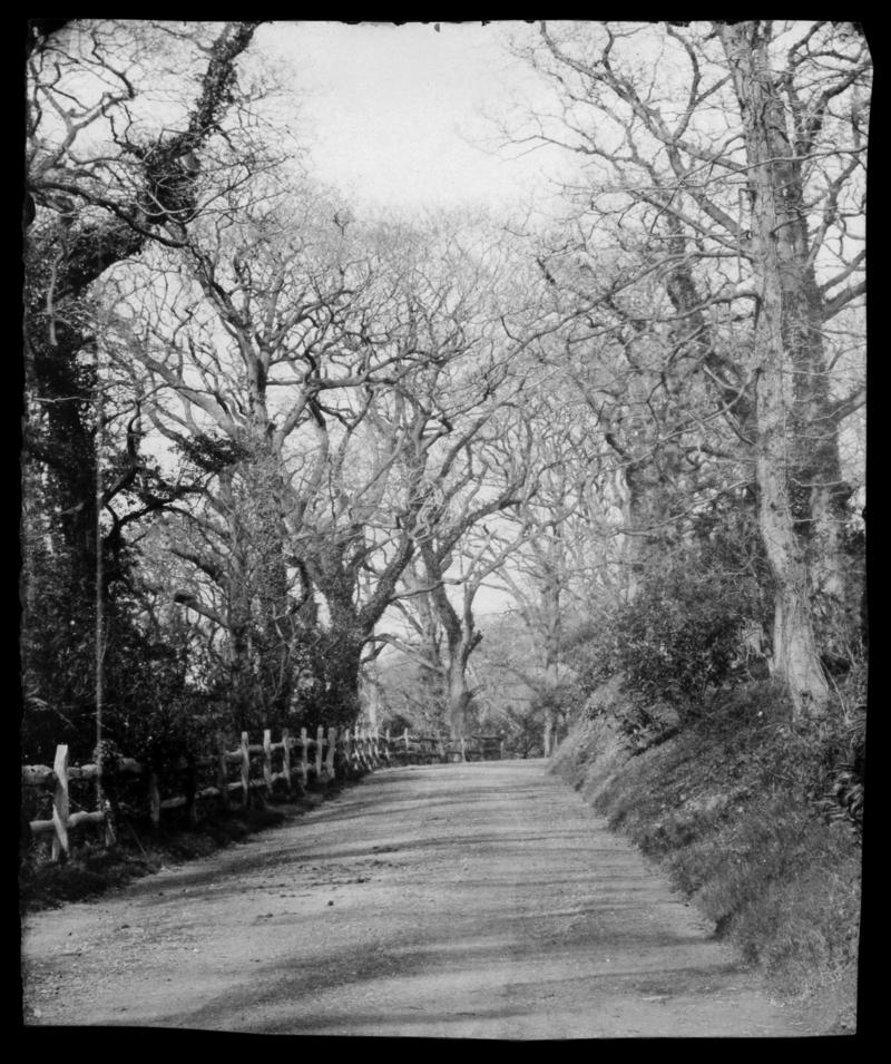 Waxed calotype negative with no tabs. Driveway to Penllergare through wooded landscape.