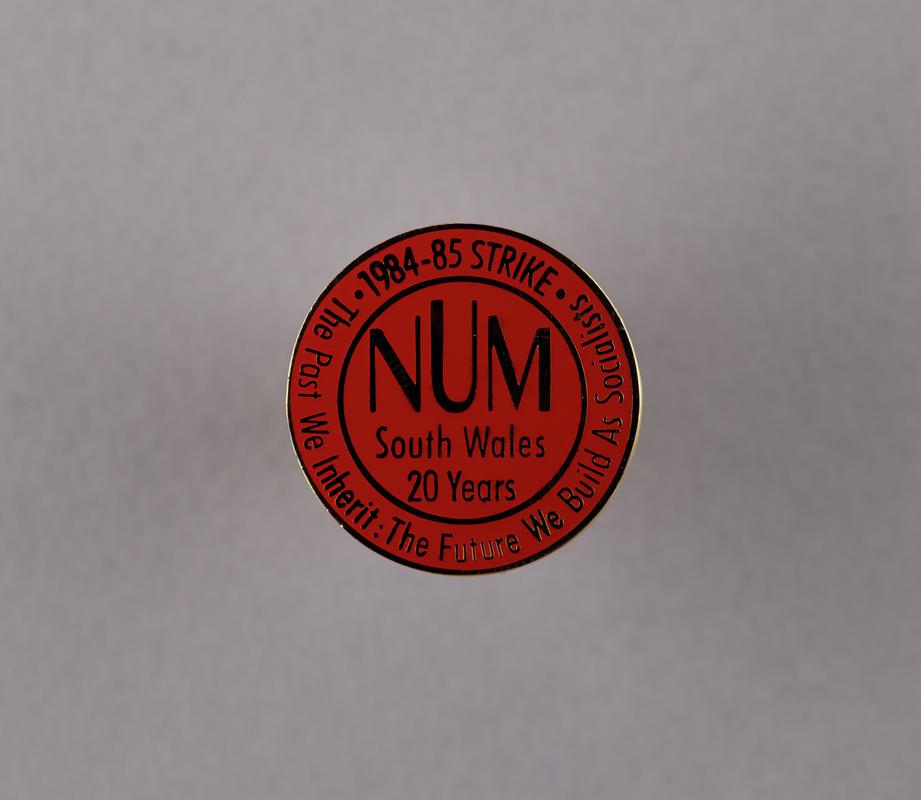 Circular brass badge with inscription embossed on front. Pin clasp on reverse.