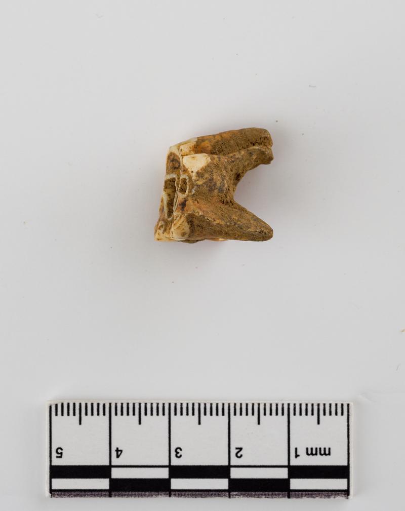 Nodiadau: Middle chamber below sand on stalagmite or, from chamber 3 sand layer and lower passage (the bag contains two labels with stratigraphic details)