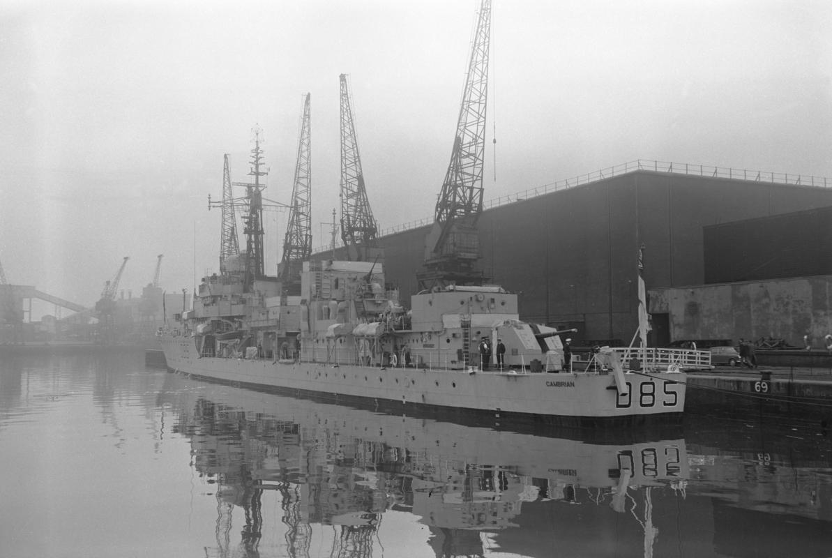 Full starboard bows view of H.M.S. LLANDAFF approaching Cardiff Docks. She was here as part of the celebrations of the investiture of the Prince of Wales.