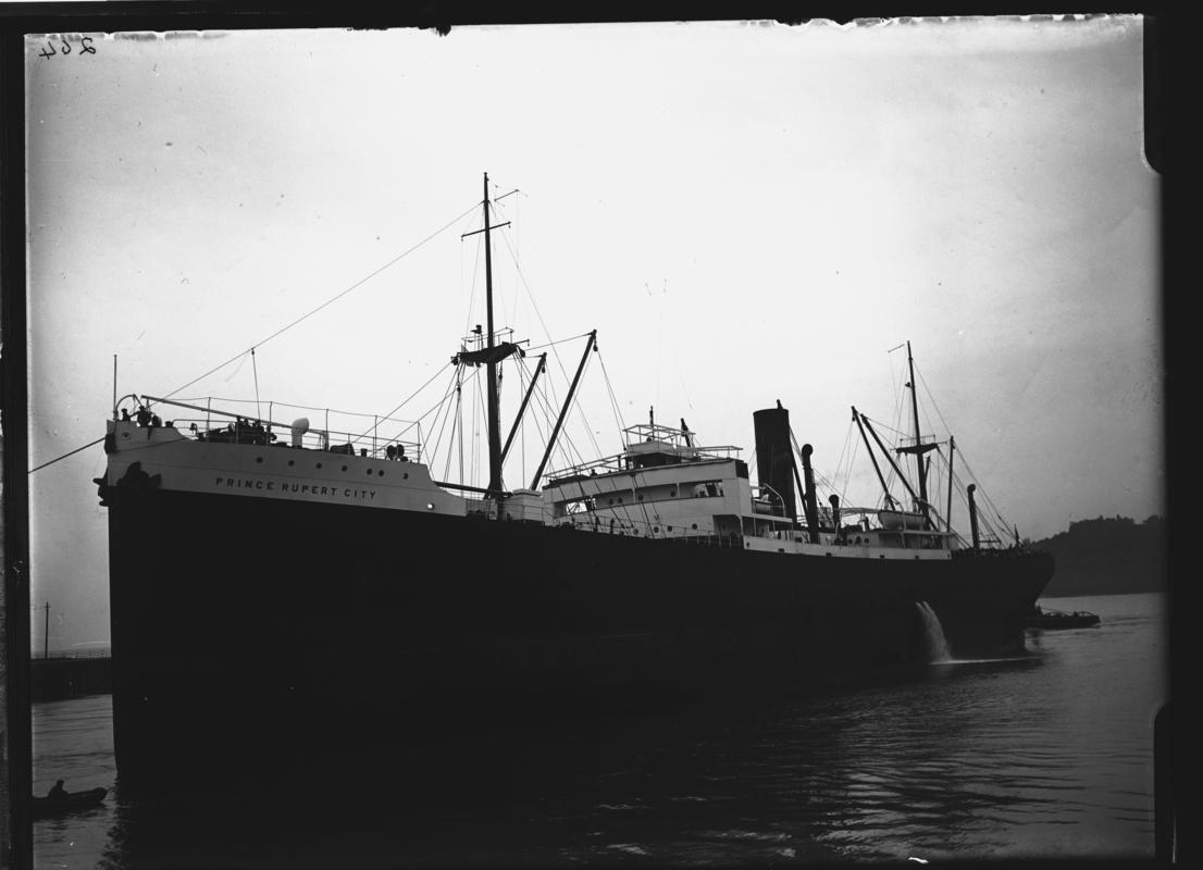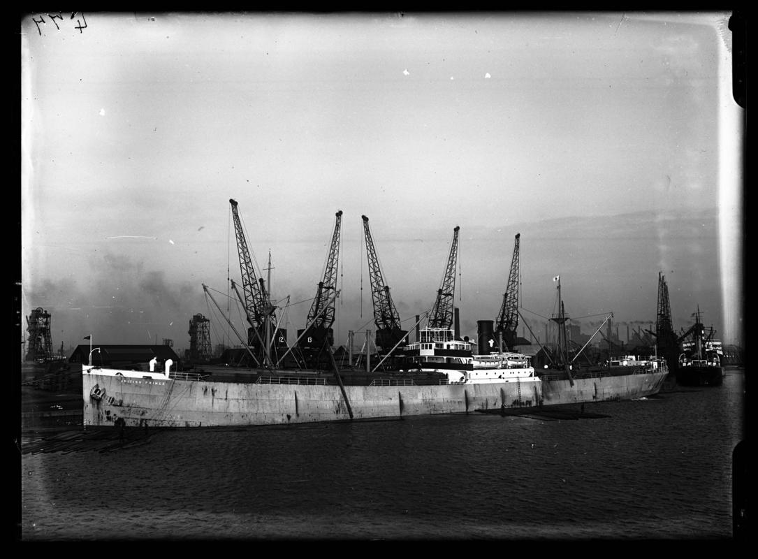 Starboard broadside view of S.S. SYRIAN PRINCE and dredger, entering Cardiff, c.1936.