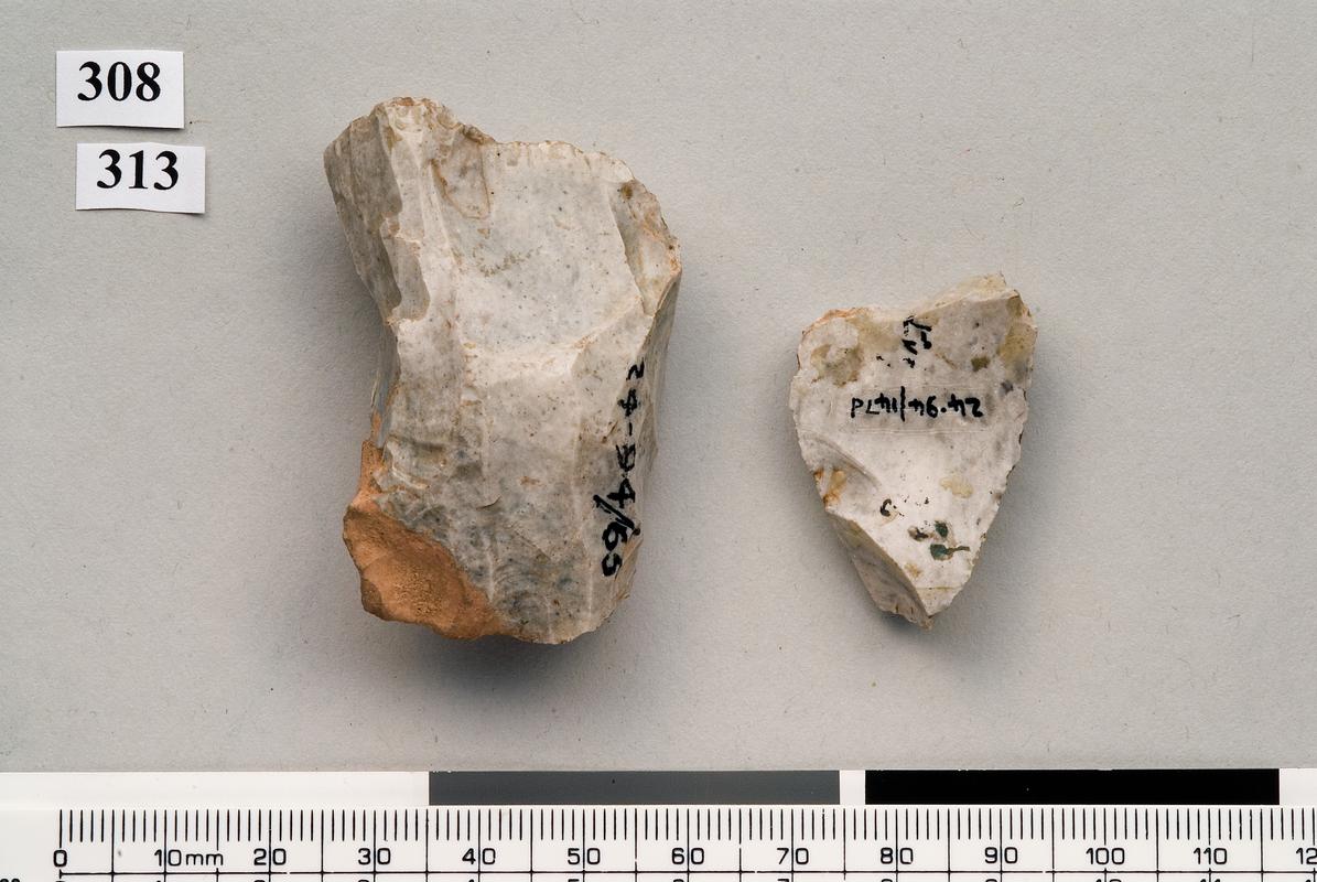 Burin with deep patination, bifacial, sub-parallel retouch. The platform is absent. The tool has traces of a pebble surface surviving showing it was made of pebble flint.
