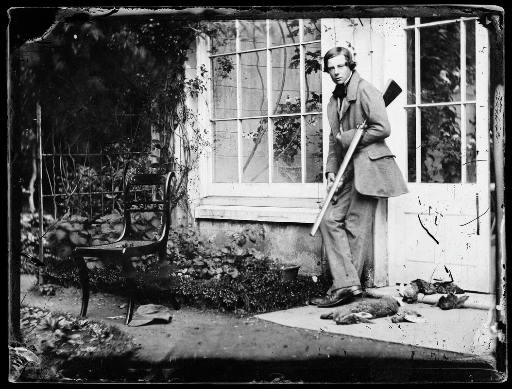 Collodion glass negative of Willy Llewelyn sat in a wicker chair.