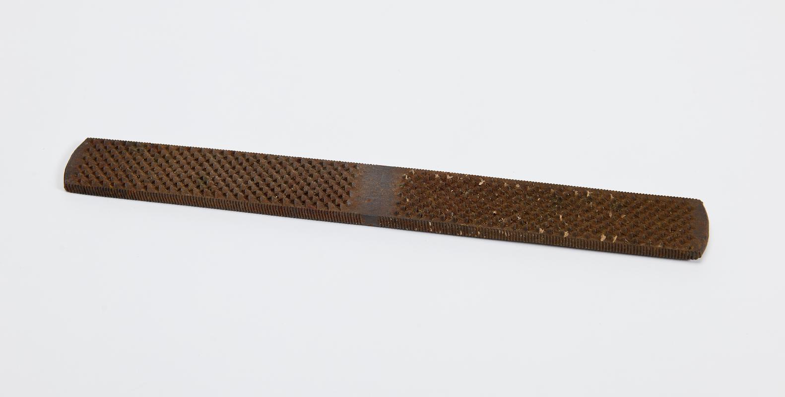 Brass handle, with 3 pronged iron fork; decorative brass screw knob fitted to end of tubular brass handle; blacksmith made (David Eckley of Sully).