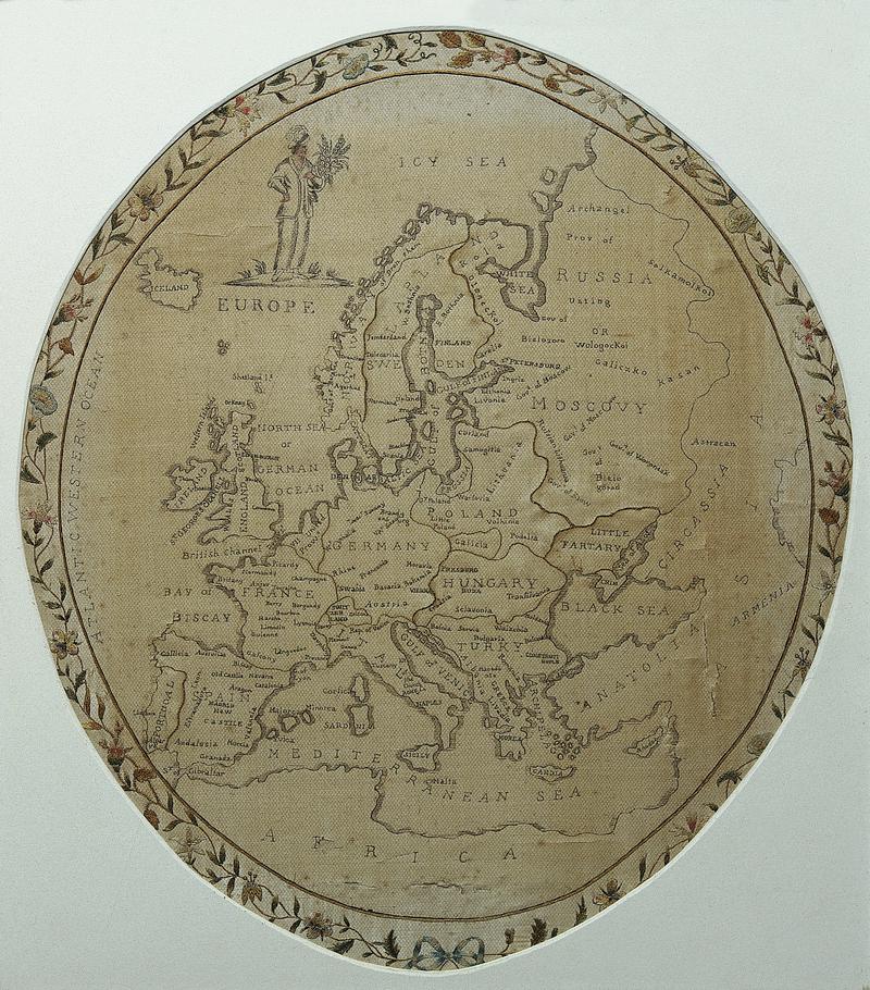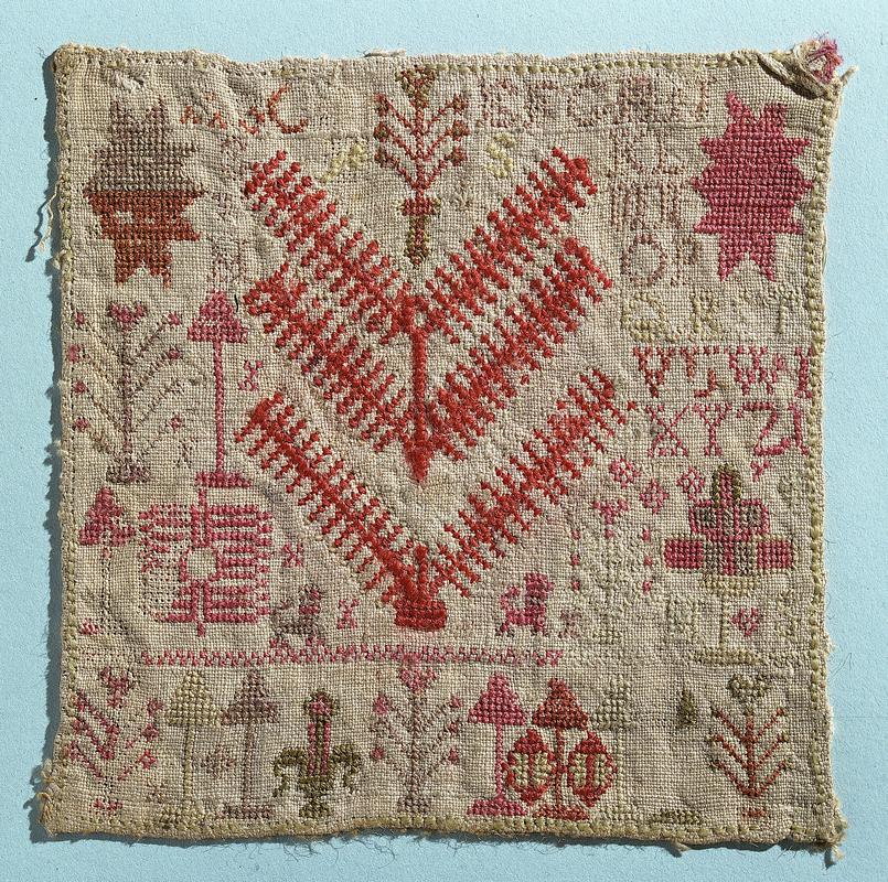 Sampler, 1824, o gynfas gwlân wedi ei frodio g edafedd sidan lliw, gan ddefnyddio amrywiaeth o bwythau yn cynnwys pwythau croes, satin a chadwyn.
