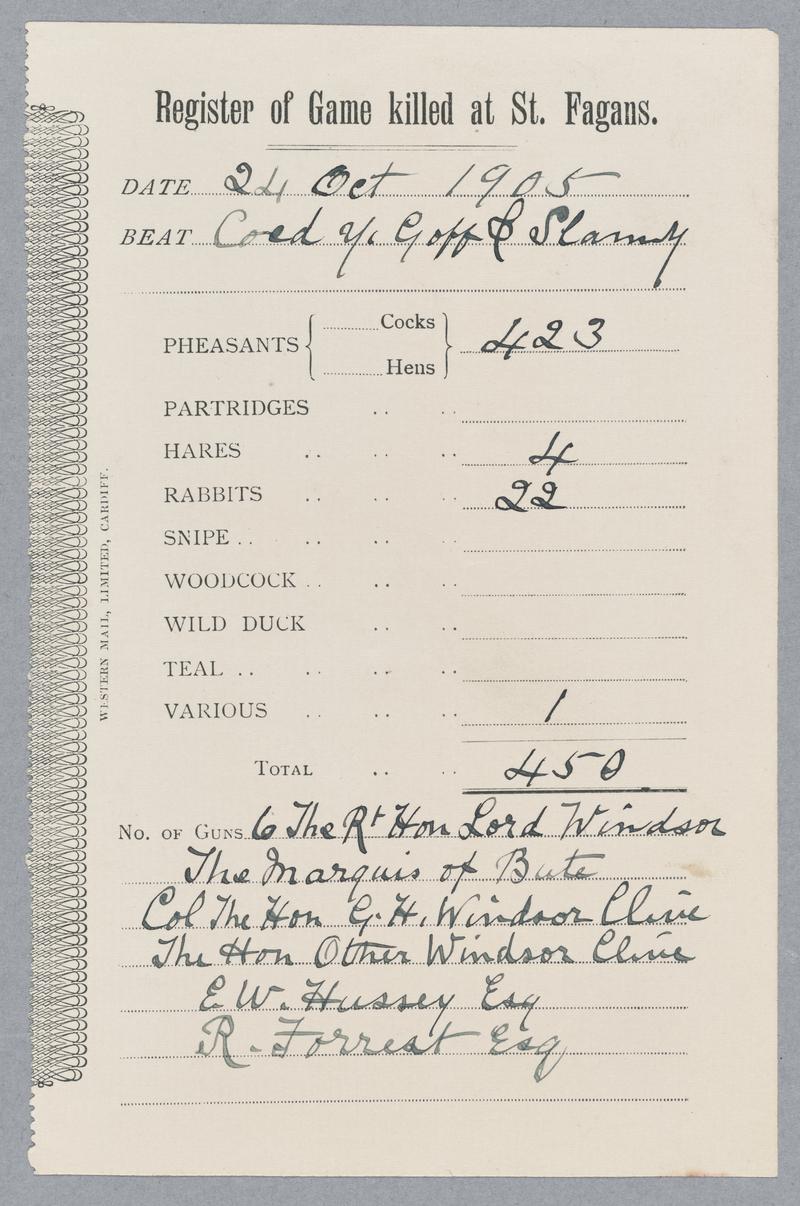 Card for St Fagans Cricket Club fixtures from May to August 1909. Front of card lists St Fagans Cricket Club officers. The President of the Club and Captain of the team was Lord Windsor, the Earl of Plymouth. The Vice Presidents were Robertert Forrest, Plymouth Estate Manager, St Fagans Castle and Col. W. Forrest.