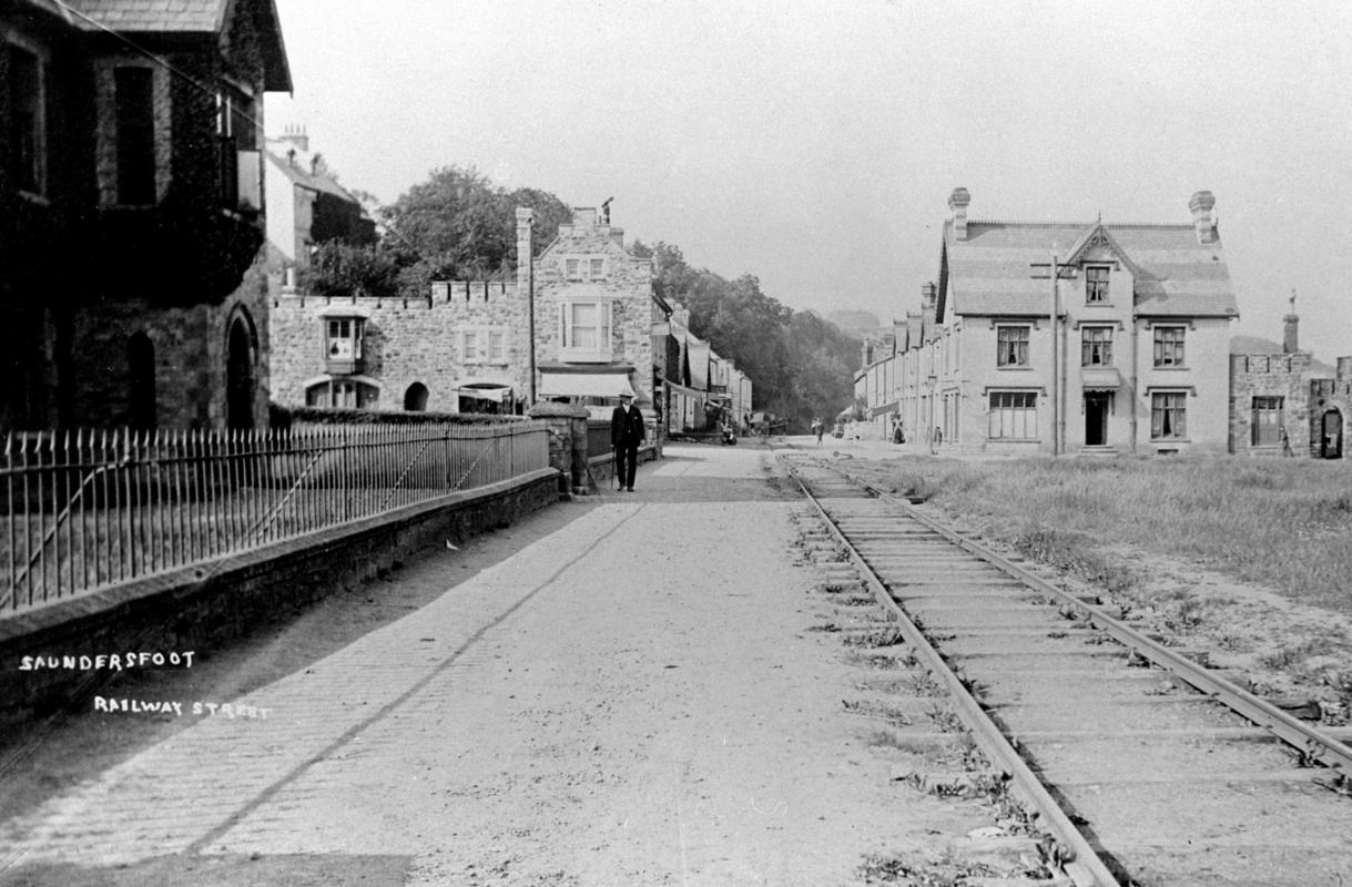 Colour postcard of "Saundersfoot Harbour and Village". Sent to Mr E. B. Jones of Swansea. Postmarked 14 December 1907.