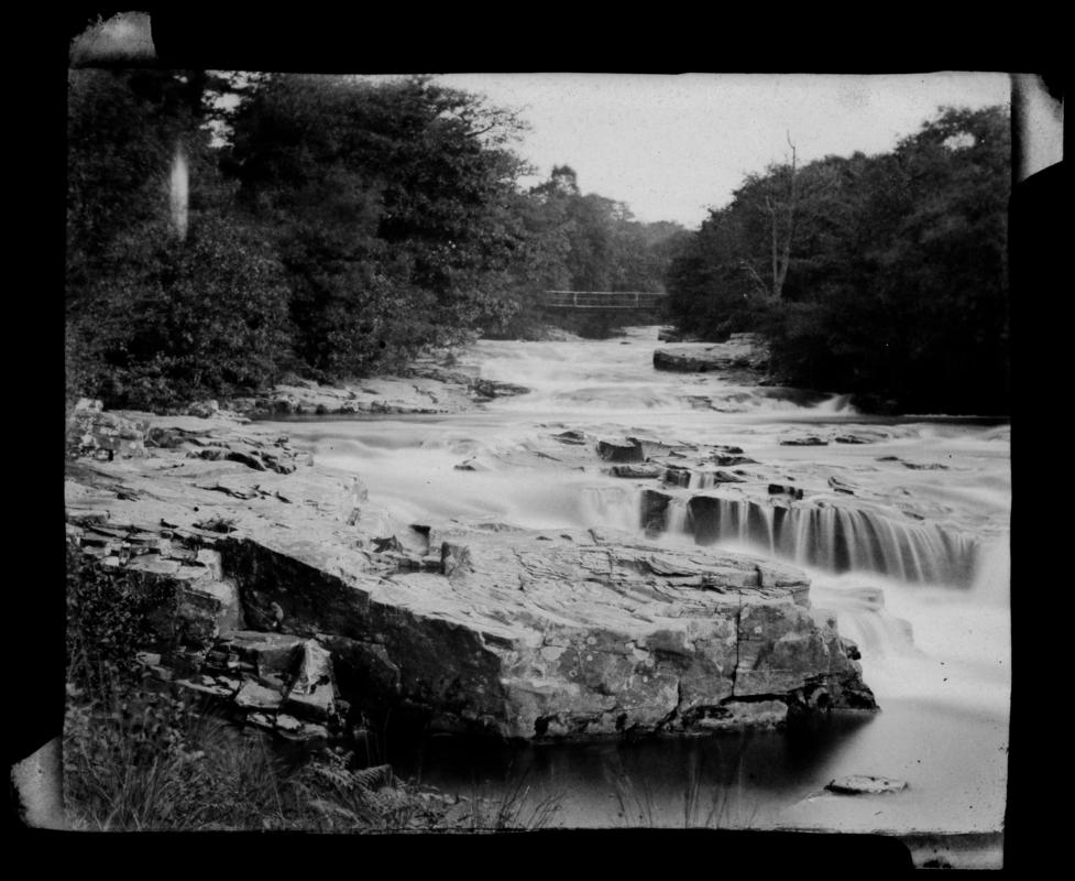 Calotype negative showing tree and rock overhanging river in the Dulais Valley. Tab at each corner.