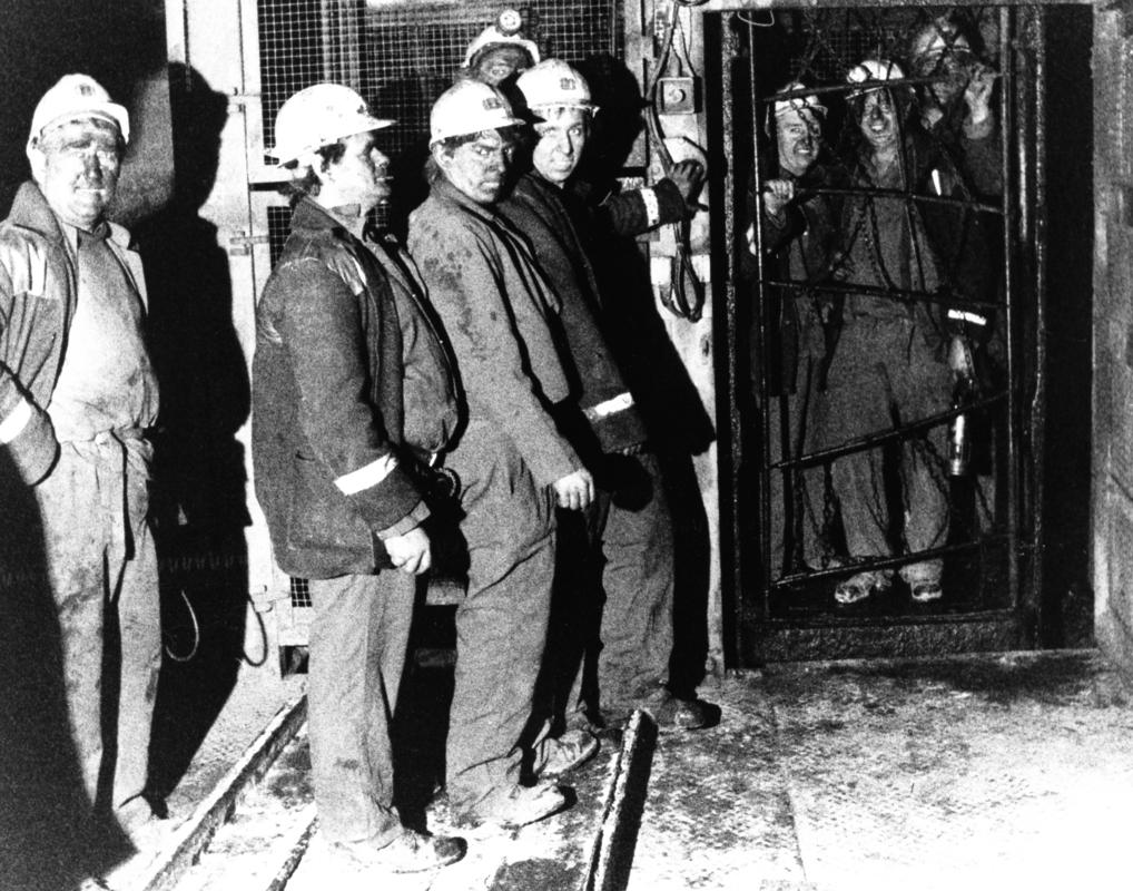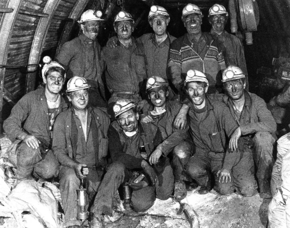 Underground view showing four miners on the TSA face after the last coal has been cut. Colin Claybrook (top), Errol Jones (middle), Reece Thomas (bottom left) and Arwel Evans (bottom right). Paper label with full details stuck to rear (torn).