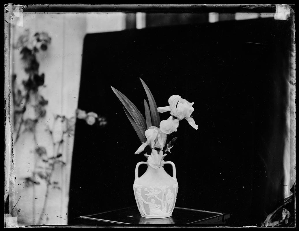 Salted paper print. View of top of vase with irises. Edges clipped from print.
