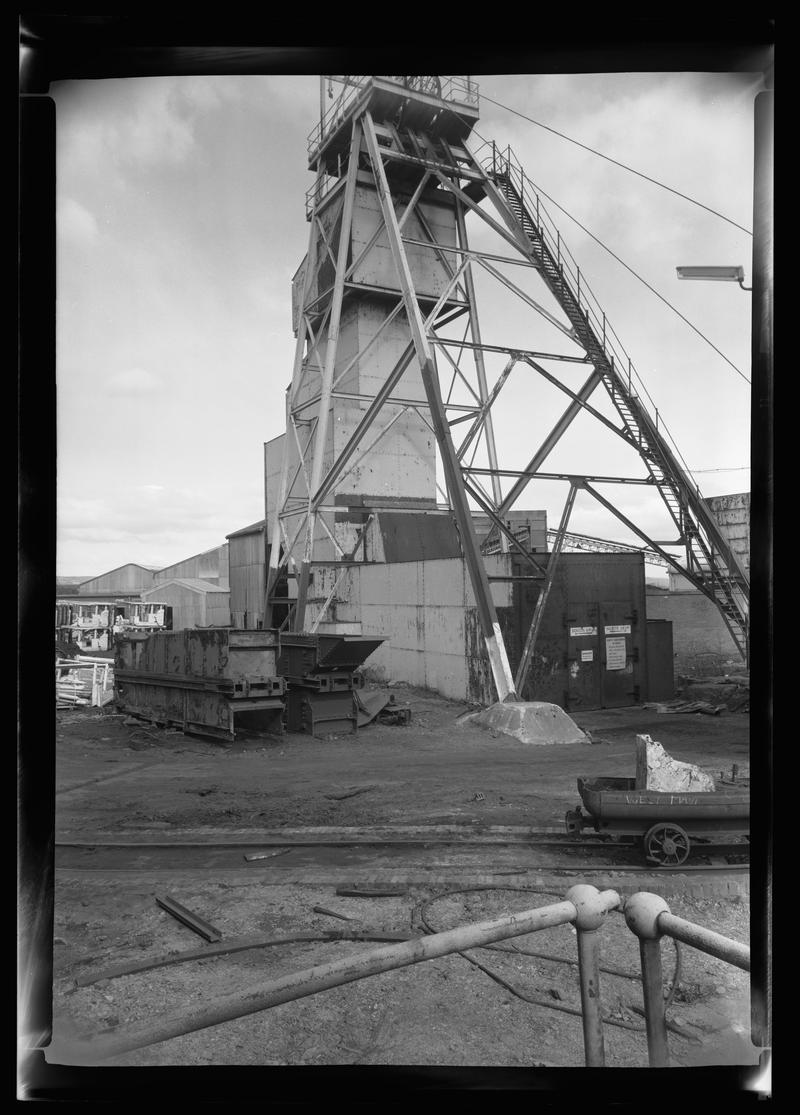 Black and white film negative showing the reconstructed pit bottom at Lady Windsor Colliery.