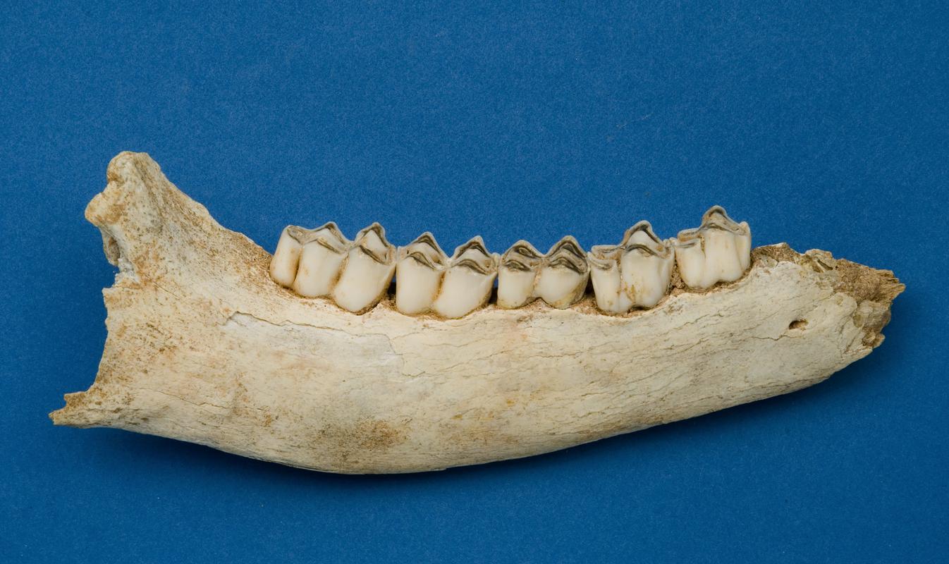 A giant deer right mandible, with the lower right 3rd premolar, lower right 4th premolar, lower right 1st molar, lower right 2nd molar and the lower right 3rd molar all present in their tooth cavities. The bone is a whitish colour and has been reconstructed from a few pieces. The surface of the bone is split and cracking. The teeth all display a moderate amount of wear. The crown of the lower right 2nd molar has sheared off flush with the mandible leaving the roots in situ.