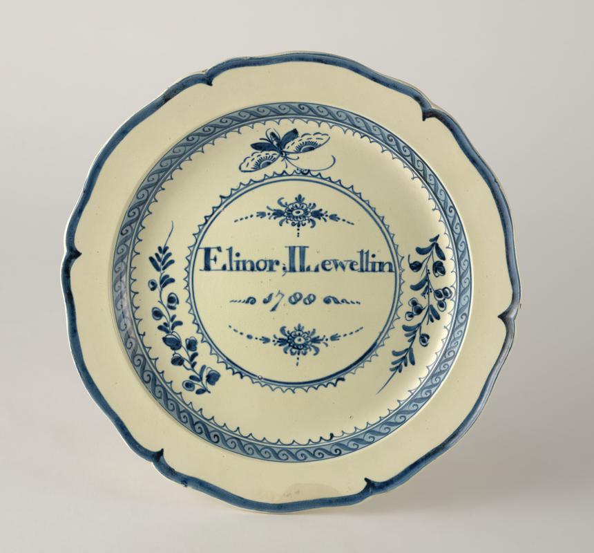 Plate, decorated in brown enamel with a border of alternate beads and dots, and an inner frieze of stylised strawberry leaves joined by a simple arcade.