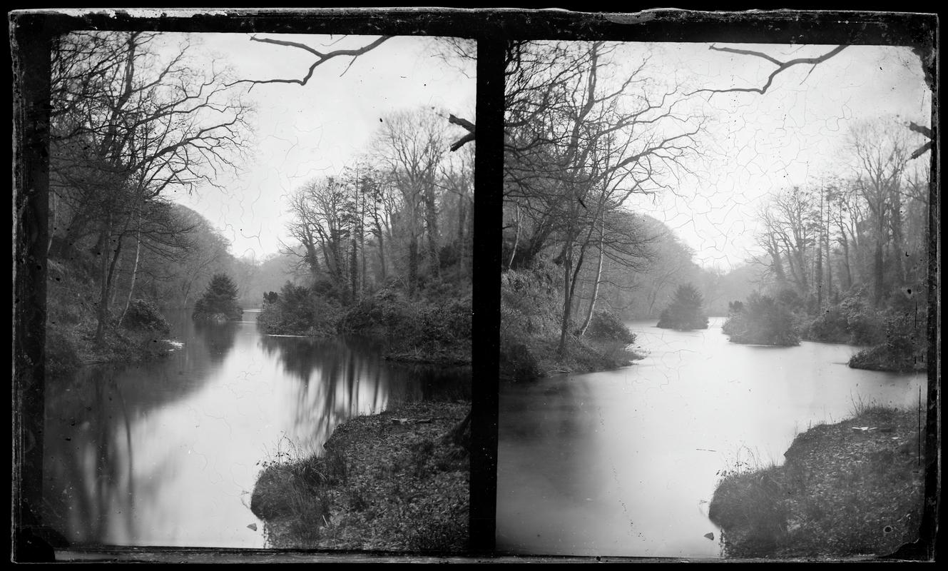 Sensitising bath for wet collodion plates. Glass bath with wooden case and lid. Neg size approx. 10½" x 12½".