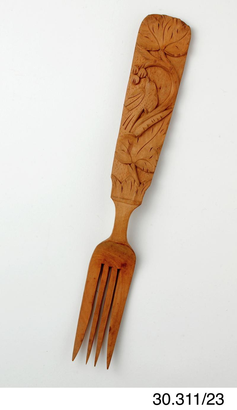 Welsh lovespoon with oval bowl; short stem with chipwork design leading to cage containing two seeds or balls surmounted by circular panel block with cut out heart shaped design in centre and the words Cymru and Wales chipworked on rim