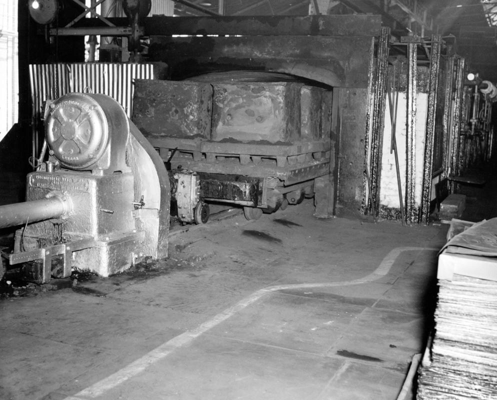 Operators removing anode from a casting machine on the electrolytic tinning line, Ebbw Vale works. Photographer's stamp on the back of the photograph.