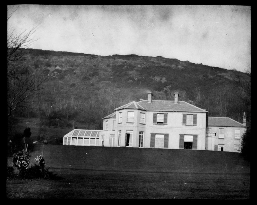 Unwaxed Calotype negative showing house at Miskin, with old tree in the foreground. No tabs on negative.