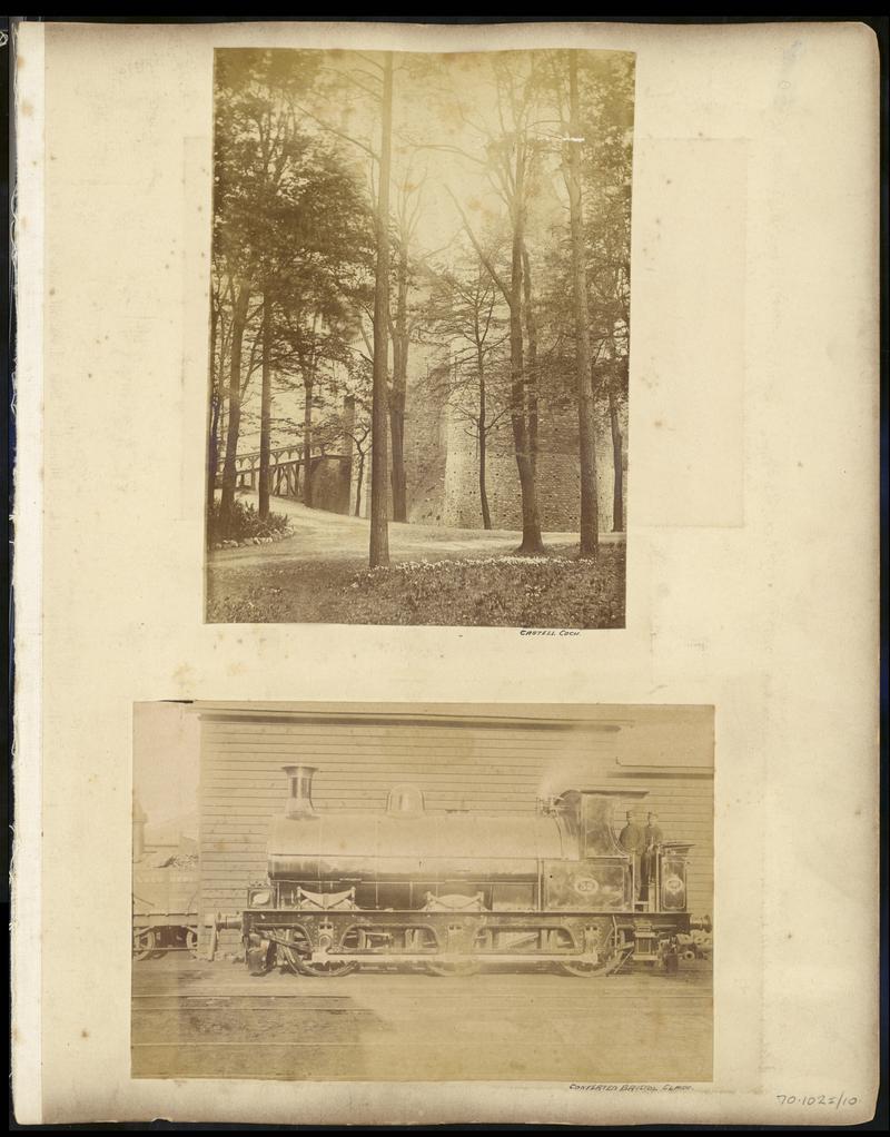 Three photographs mounted onto cream card, two on front and one on reverse. Shows, Front: Castell Coch and a T.V.R. Converted Bristol Class locomotive. On reverse: Barmouth Bridge and Cader Idris.