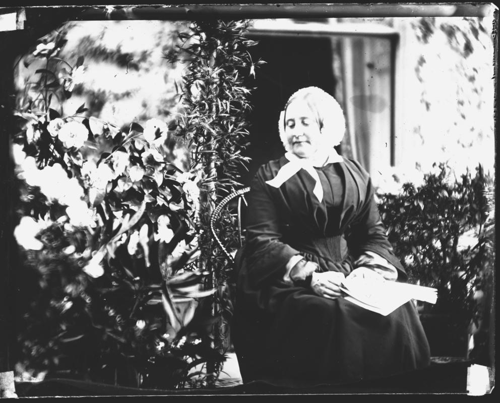 Collodion glass negative of Lucy and Elinor with basket on chair. Taken on the porch at Penllergare.