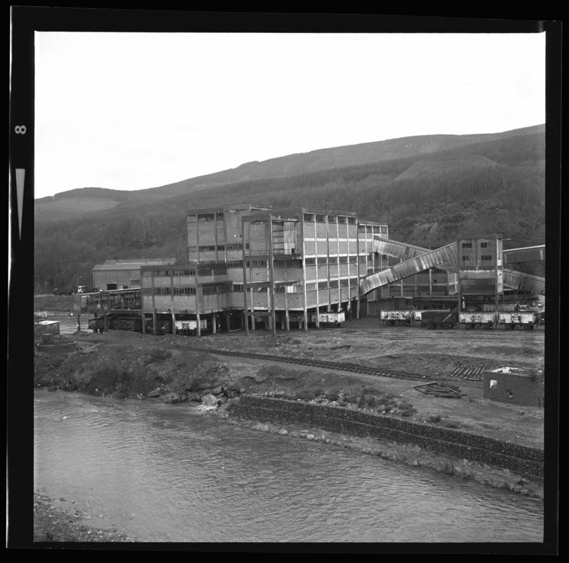 Negatif ffilm du a gwyn yn dangos iard goed Glofa Aberpergwm.