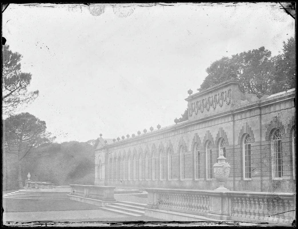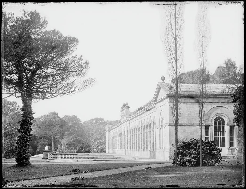 Collodion glass negative showing a wigwam on the banks of the lake with a Canadian canoe on the water. Variant of 86.31I/329 & 335.