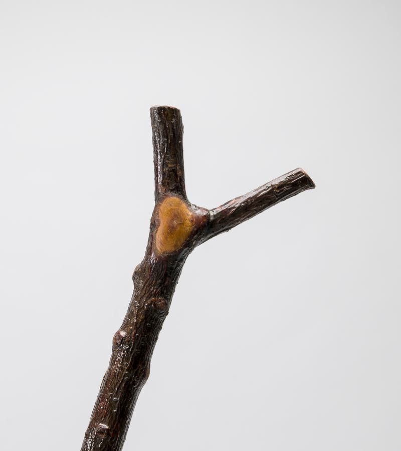 Unpeeled blackthorn stick; handle carved and painted to represent a puffin's head; 2 holes at neck with leather cord passing through; brass and aluminium ferrule