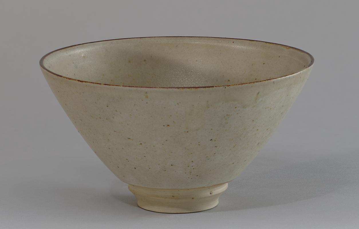 Bowl, stoneware, ovoid form tapering to the foot, turned groove round the foot, surface incised with hieroglyph-like marks, pale oatmeal glaze.