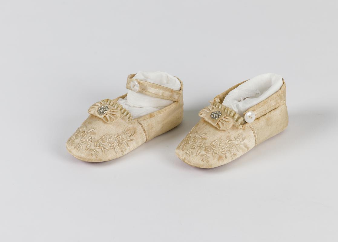 Pair of black glacé leather shoes. Worn in October 1930 by Charles Mills, Port Talbot, for a wedding. Later worn as 'best' pair. Pointed toes. Stitching around vamp, toe cap and back of heel. Scratch on right toe. Cotton laces, metal eyelets on lace holes (six pairs of eyelet holes). Smooth leather soles;. Crcular metal and rubber additional reinforcement on heels, added at later date. Suppliers' stamp inside: 'C.W.S' (Co-operative Wholesale Society).