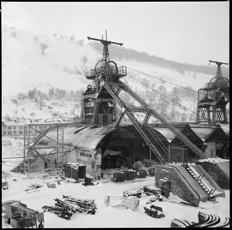 Black and white 35mm film negative showing Six Bells Colliery, 1970s.