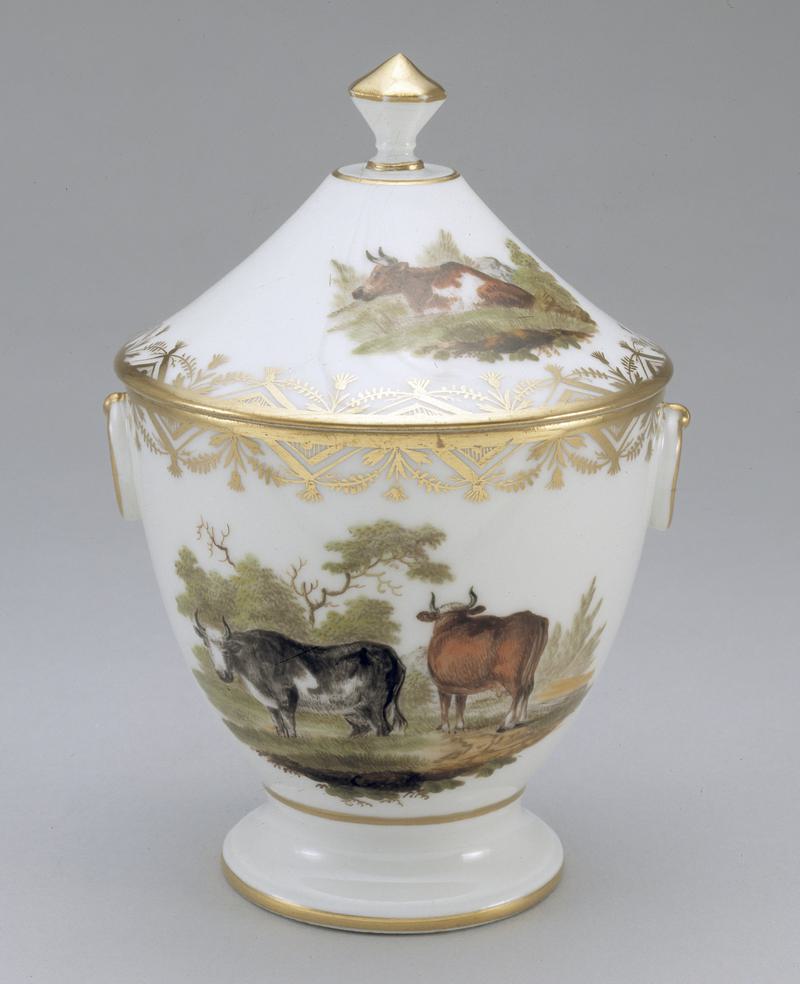 Sugar bowl, hard-paste porcelain, cylindrical sides tapering inward at base, depressed cover with acorn finial and moulded leaf; sides decorated in polychrome enamels with an exotic bird in red, yellow, brown and purple, perched on a U-shaped branch issuing from a pile of rocks, gilt line at lip, opposite a foliage spray; cover painted with a wreath of foliage inhabited by two brightly painted birds, acorn finial gilded and modelled leaf painted in green, gilt border to rim.