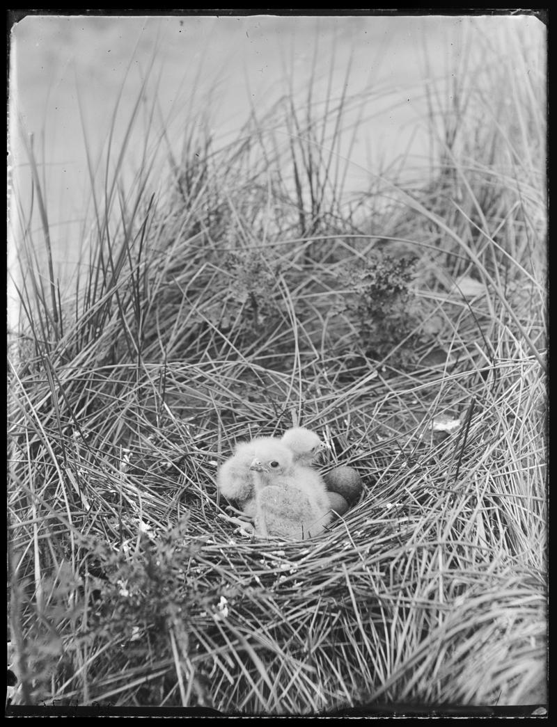 A young Oystercatchers (Haematopus ostralegus) and 3 young Merlins (Falco columbarius), on Kenfig Sands, Bridgend. Photographed 23 June, 1912.