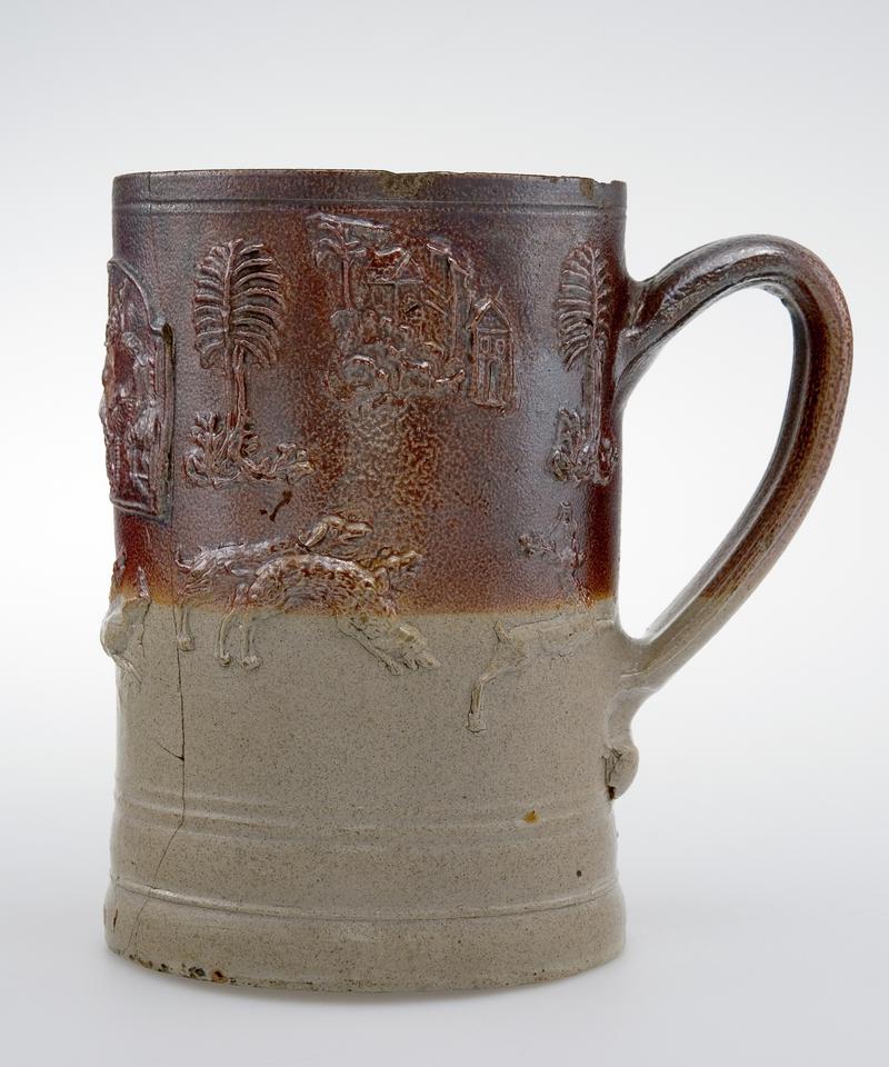 Plant pot, solid blue jasper, drum-shaped form with cylindrical sides and spreading foot and rim, decorated with applied ornament in white relief with around the centre of the exterior body a frieze of classical dancing female figures, around the foot a border of overlapping leaves. The lip-rim chipped.