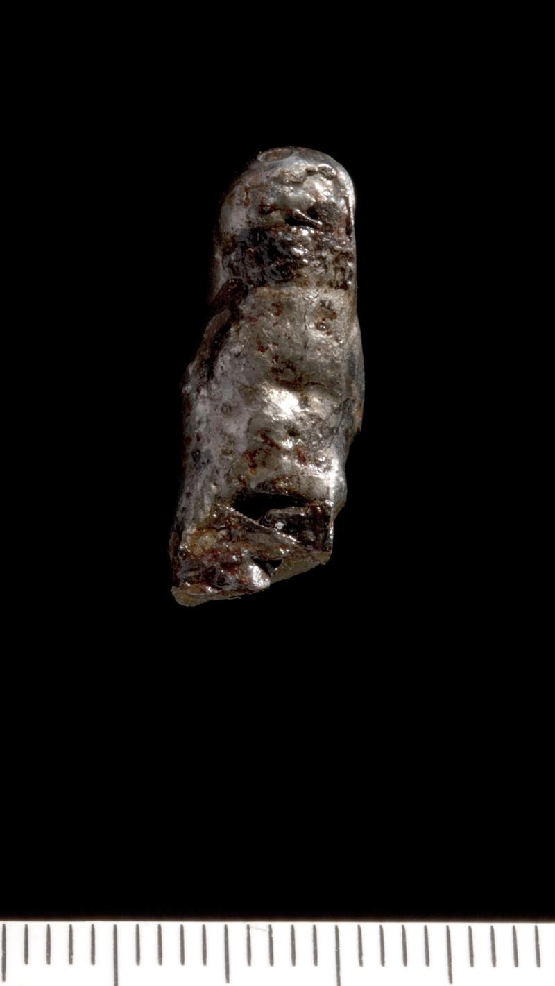 One end of a 'finger shaped' silver ingot severed with a single blow (hack silver) on the upper surface along one edge there are at least four nicks of slit type (purity tests).