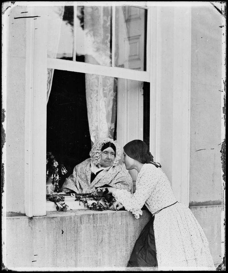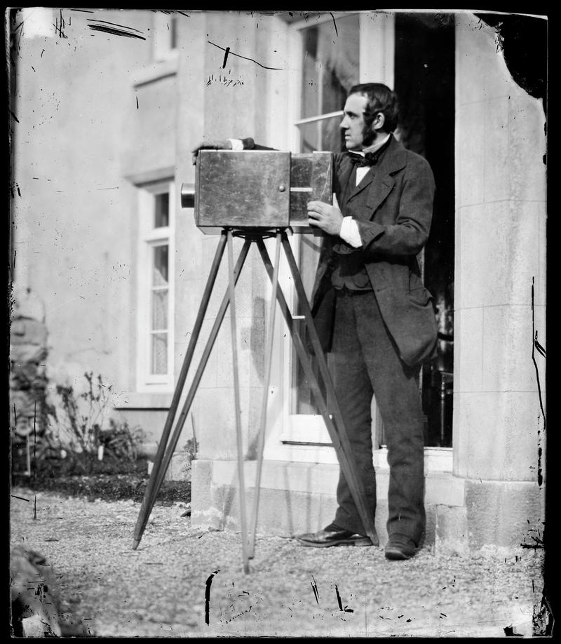 Collodion glass negative. Self portrait of John Dillwyn Llewelyn sat with elbow on table with two flower pots of spring flowers.