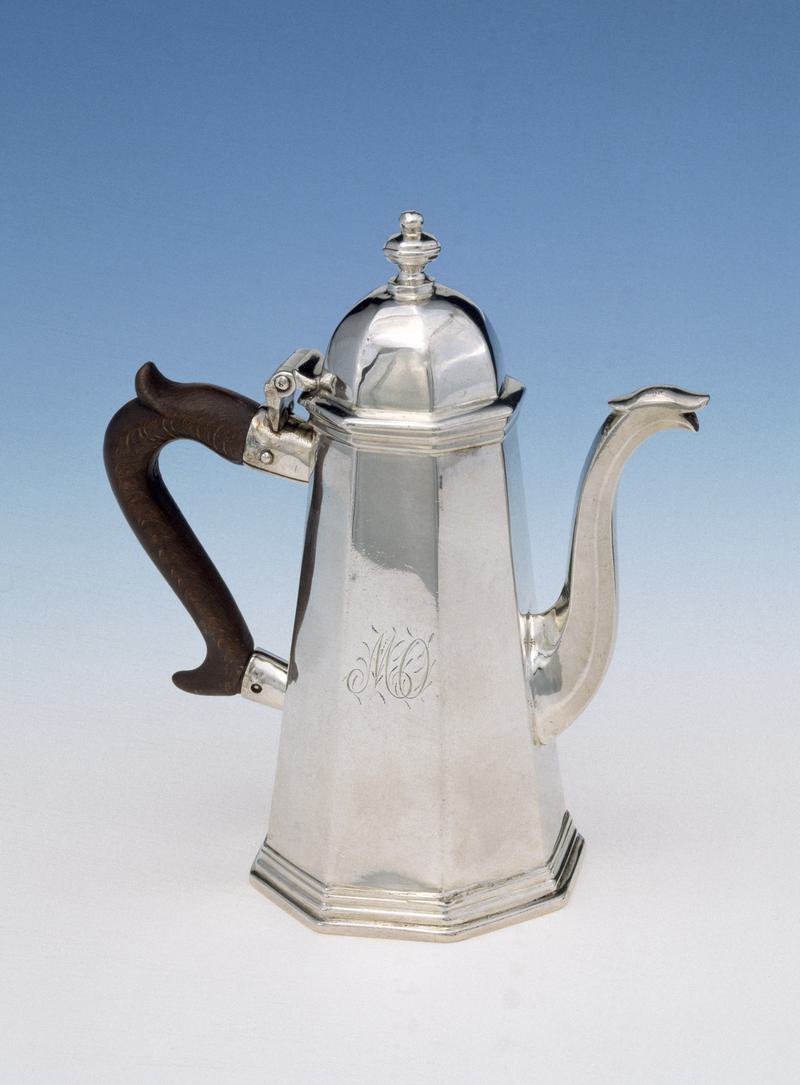 Coffee pot, thin tin-plate, pear-shaped form with circular foot, narrow curving spout and ear-shaped strap handle, round domed cover attached by a hinge to the coffee pot; covered with a black japan to the underside of the foot and to the rest of the exterior surfaces a dark crimson japan with a crazed finish.