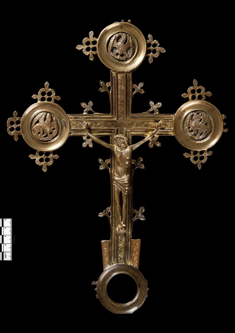 Figure of the virgin Mary from a processional cross. The figure is draped in a mantle from the head, facing slightly to the left, and has her hands over her breast. The rear of the figure is comparatively flat and plain. The base of the figure has a double moulded border before a faceted stem, thinning to an arm of rectangular cross section, with no decoration. The arm has broken in antiquity. The remnants of gilding survuve over the figure and the base.