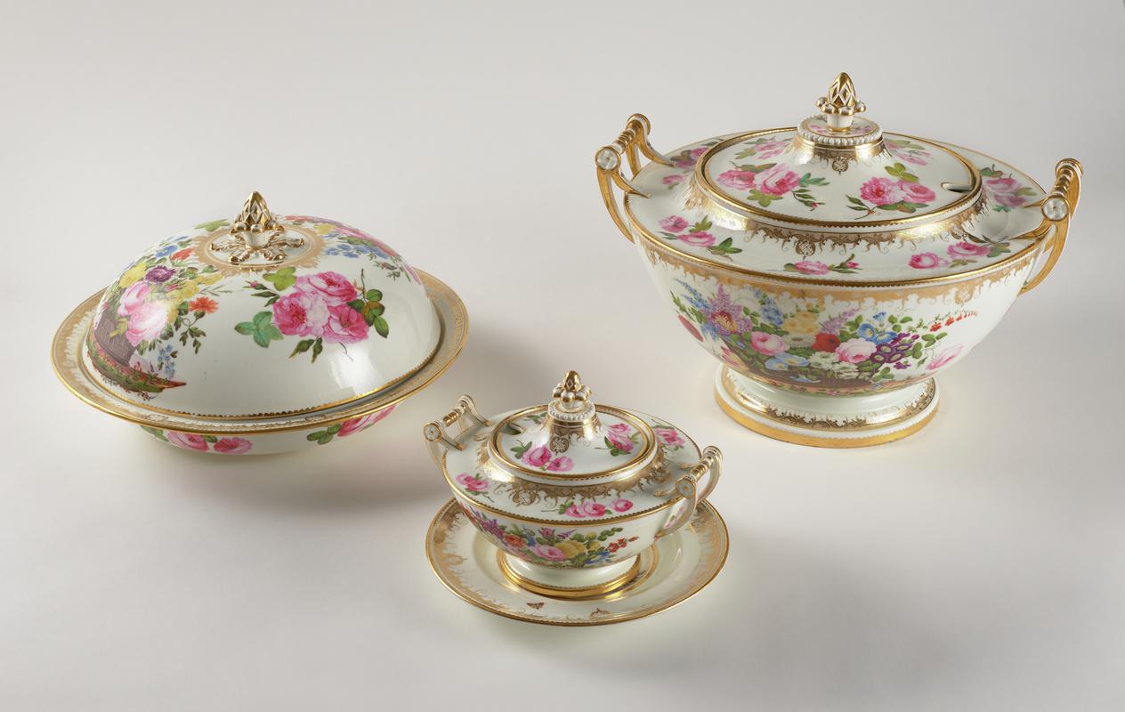 Cream or sauce tureen, cover and stand, soft-paste porcelain, 'duck egg' type with greenish translucency, slight green tinge to the glaze. Tureen, round, on a turned pedestal foot, two up-turned spindle handles with moulded florets; painted on each side with a vertical-woven basket, overflowing with garden flowers, on a background of earth, grass and flowering plants, and with a spray of three pink roses under each handle; border of scrolled and seeded gilding on shoulders; gilt dentil border at foot, shoulders and lip, and handles partly gilded. Flat-topped conical cover, with aperture for a ladle, beaded below a pineapple finial; painted with three sprays of two pink roses below border of scrolled and seeded gilding; dentil gilt line to edge and finial partly gilded. Stand, round, with recessed centre, on shallow foot rim; painted in the centre with a similar basket of garden flowers; the rim painted with two insects, and with a band of scrolled and seeded gilding and gilt dentil border.
