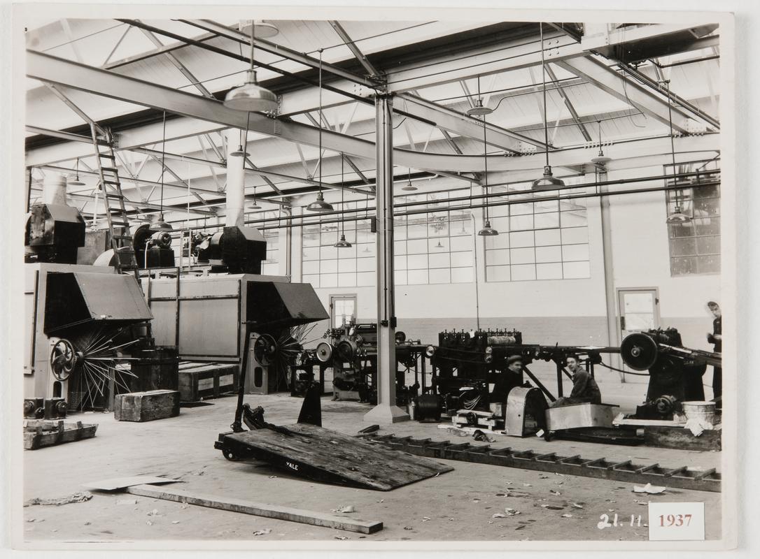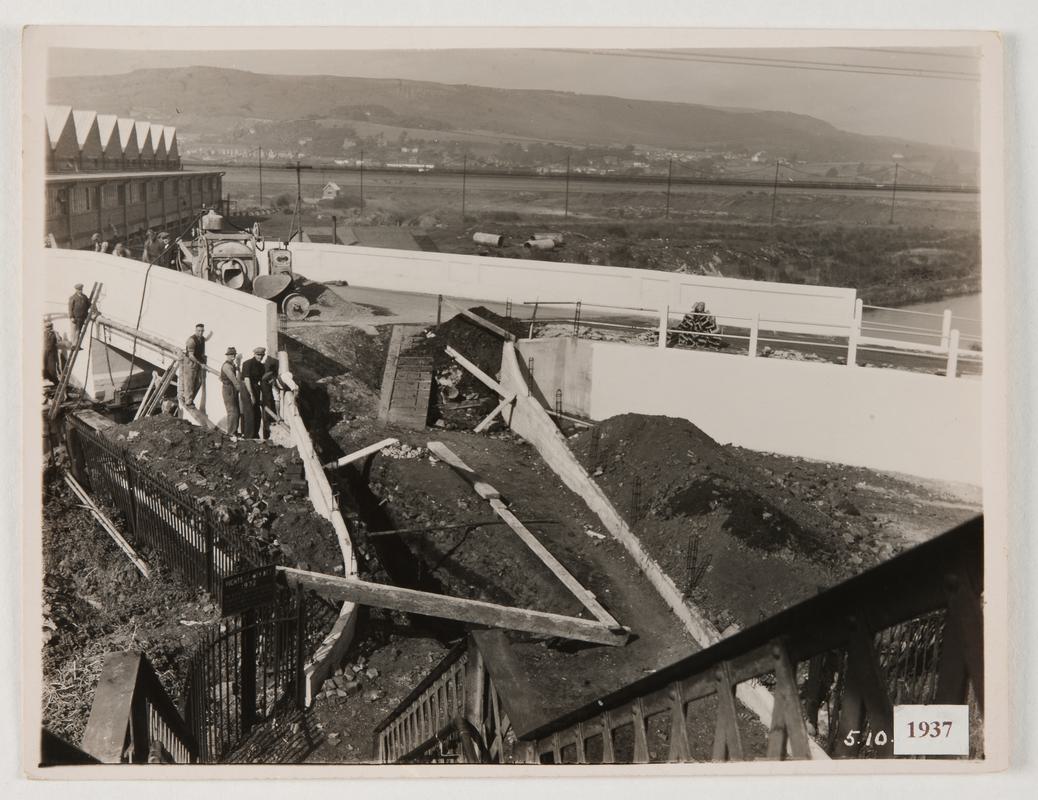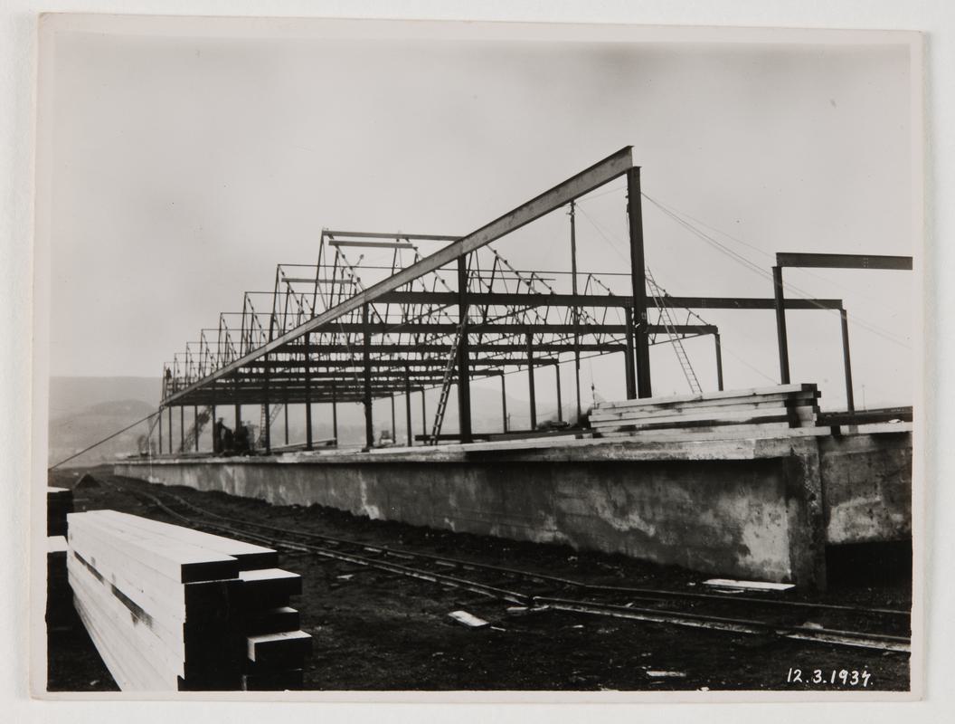 Newly installed scrap conveyor system next to the railway sidings of the new Metal Box Factory, Neath. Photographer's stamp on the back.