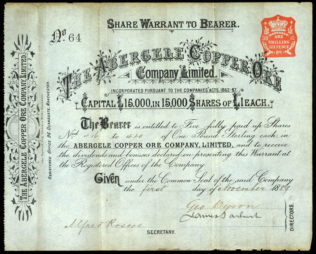 - Tystysgrifau cyfrannau o ddiwydiannau a thrafnidiaeth Cymru; yn arbennig cwmnïau mwyngloddio anfferrus.