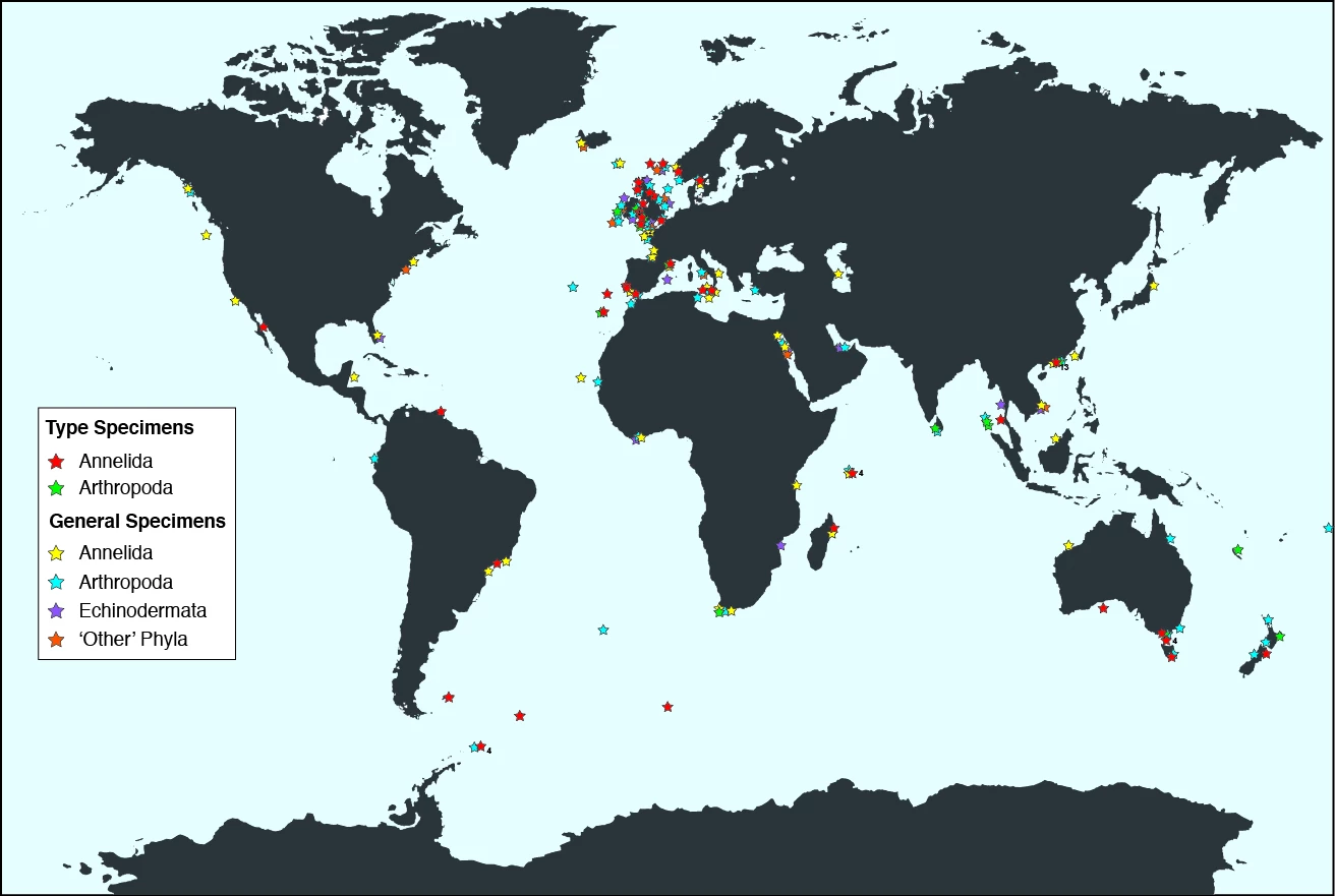 - Er bod y rhan fwyaf o samplau o Brydain, mae teipddeunydd Crustacea a Polychaeta yma o dros 60 o wledydd.