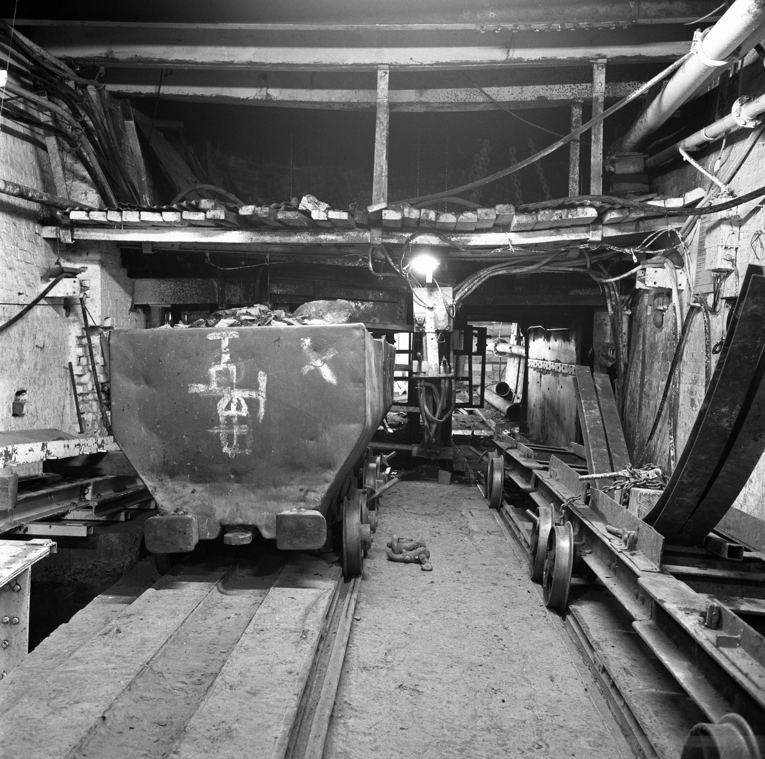Pwll Glo Cynheidre, tramiau glo mewn man llwytho tanddaearol, tua 1978