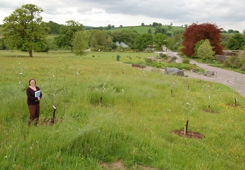 Jess Gould gyda Sorbus stirtoniana yng Ngardd Fotaneg Genedlaethol Cymru.