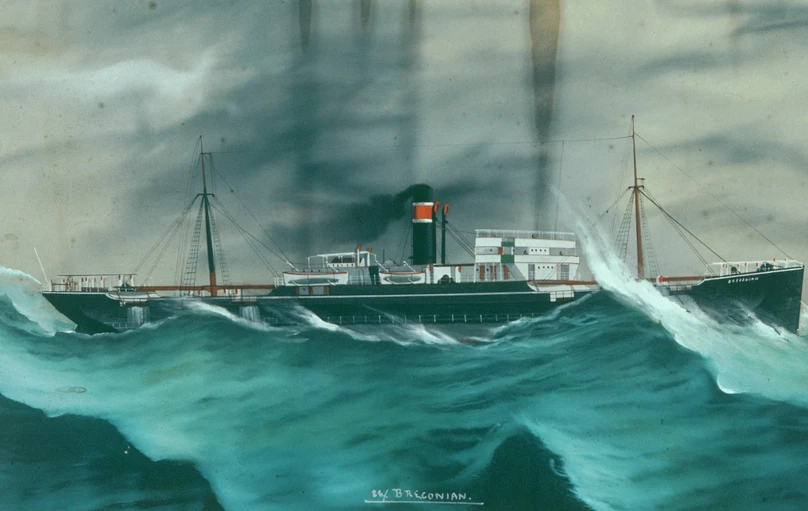 Llun heb ei lofnodi o'r Breconian mewn storm yw hwn. Adeiladwyd y llong ager ar gyfer John Mathias & Sons o Aberystwyth. Roedd yn anghyffredin gan fod y dec yn gulach nag arfer a bod y dec tyredau a osodwyd ar gorff y llong yn ymestyn o'r blaen i'r starn. Roedd y cynllun newydd hwn yn golygu bod y llong yn fwy proffidiol i'w rhedeg. Roedd y cynllun mor llwyddiannus nes bod 429 o longau deciau tyred wedi'u hadeiladu rhwng 1892 a 1911.