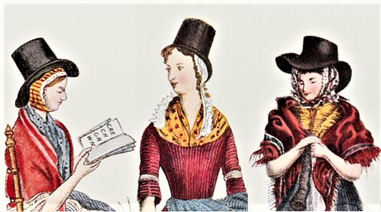 Atgynhyrchiad o 1931 o gardiau post “Dull-wisgoedd Cymru/Cambrian Costumes“ gan Arglwyddes Llanofer ym 1834 (wedi'i docio)
