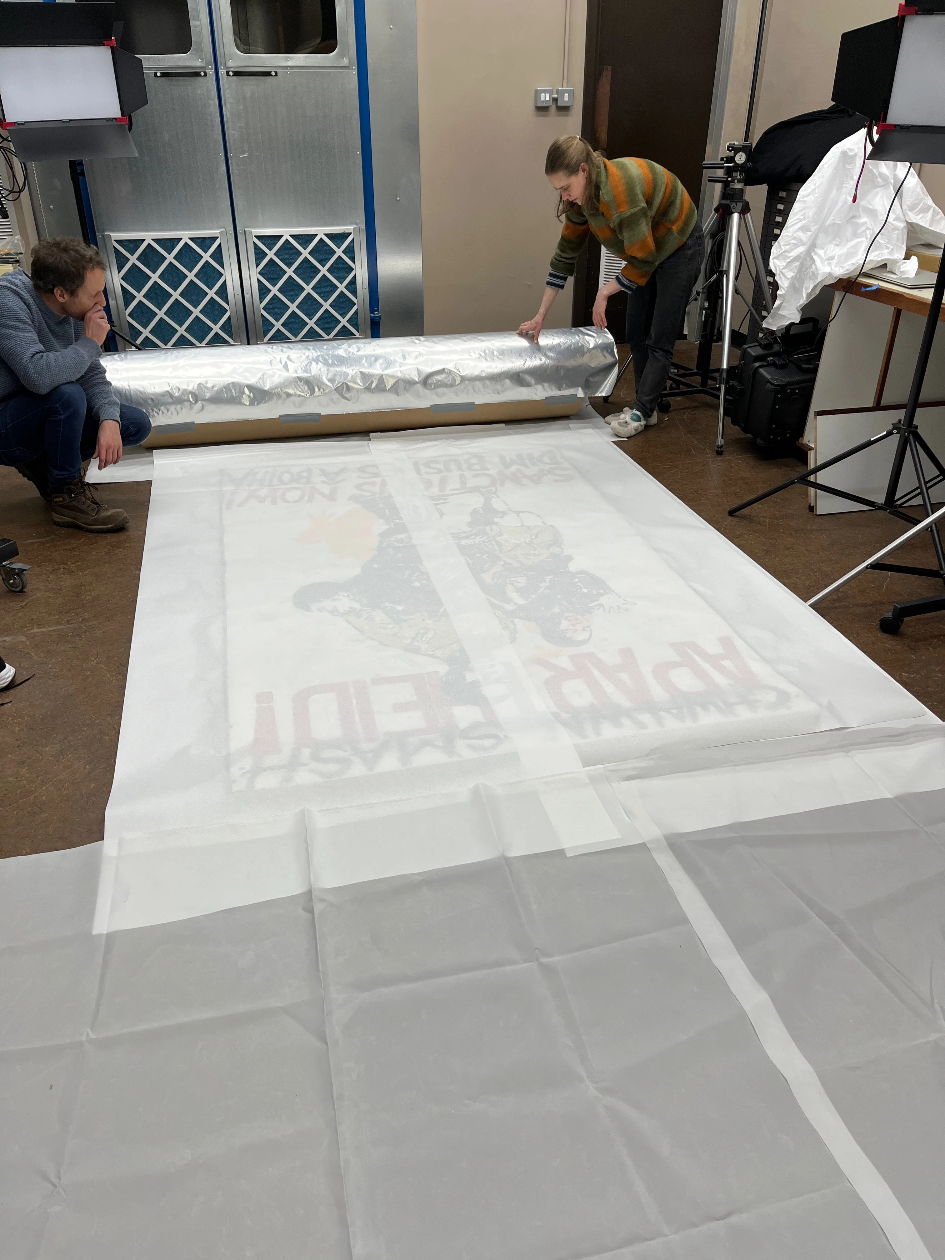 Ar ôl cwblhau’r gwaith cadwraeth, lapiwyd Sanctions Now o amgylch tiwb cardfwrdd mawr (40 cm x 2 m) wedi’i gorchuddio ag ALUVP. Cyn ei rholio gosodwyd y faner rhwng haenau o bapur wedi’i orchuddio â silicon er mwyn atal yr arwyneb rhag cyffwrdd â’i gilydd ac atal y paent rhag trosglwyddo. Lapiwyd y cyfan wedyn mewn lliain hwyliau polyestr i’w amddiffyn rhag llwch, a’i glymu gyda thâp cotwm.