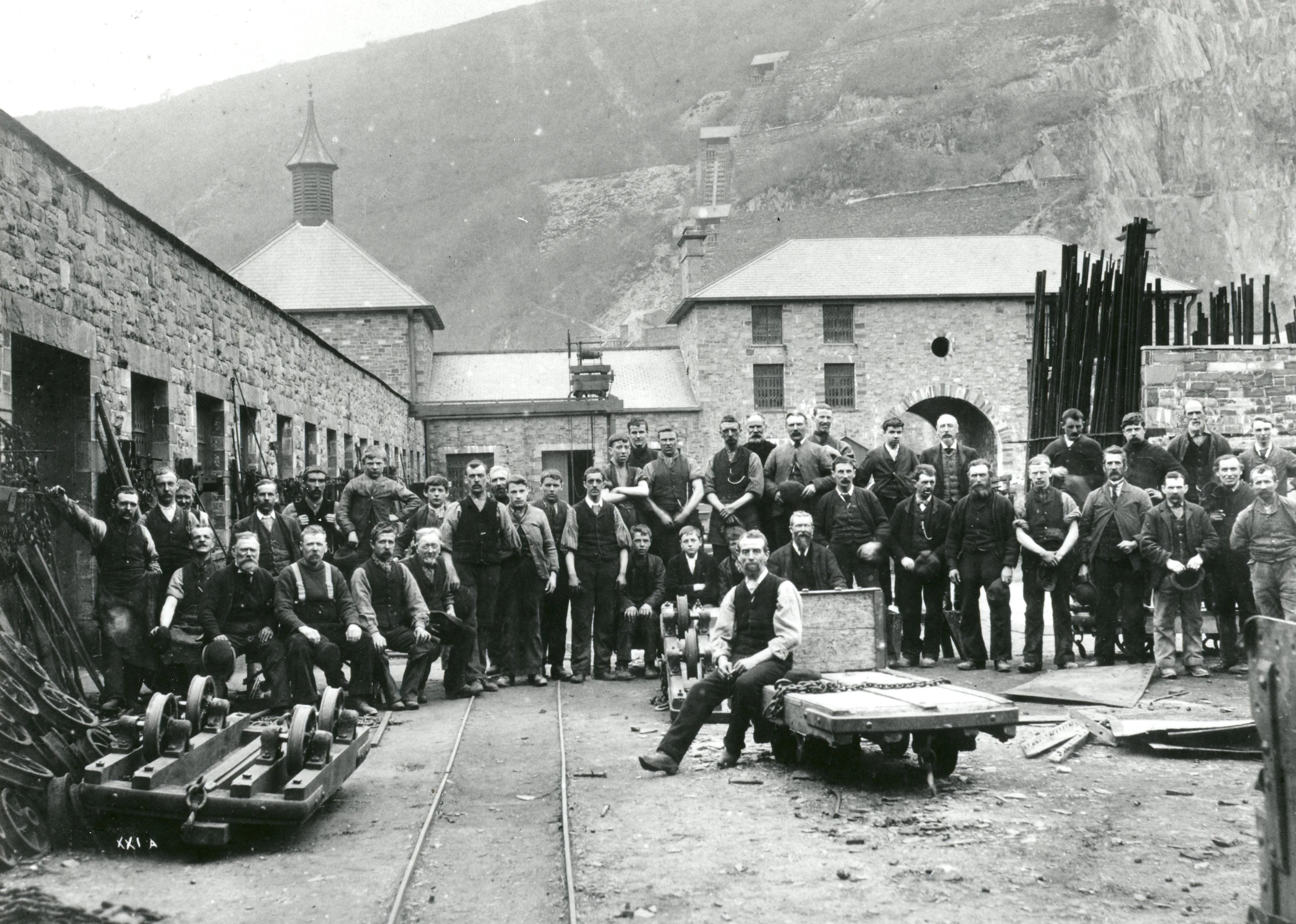 LLun archif - gweithwyr yng ngweithdai diwydiannol y Gilfach Ddu tua 1890